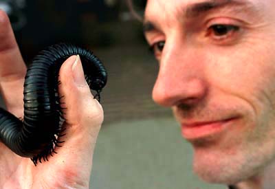 A keeper of natural history at a Sheffield museum kept himself and visiting children amused with a giant millipede during an Exotic Animal Day, which attracted thousands of visitors to a display of snakes, insects, lizards and giant spiders. He admitted that he loved snakes and millipedes, but was more nervous of spiders. "They can move fast", he pointed out. "And they jump". |